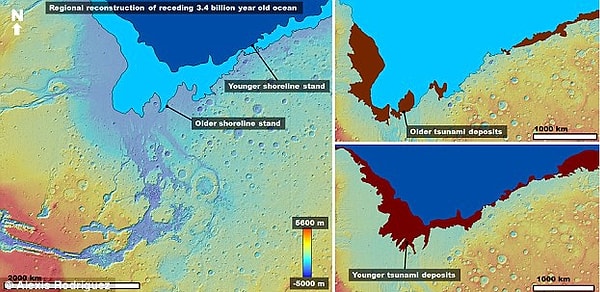 Также стало известно о двух исторических мегацунами миллиарды лет назад, приобразивших красную планету. Зашифрованная в цвете цифровая модель исследуемой области (на картинке) показывает две предполагаемые береговые линии древнего Марсианского океана, существовавшего примерно 3,4 млрд лет назад.