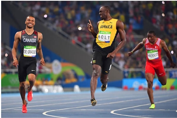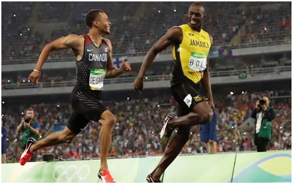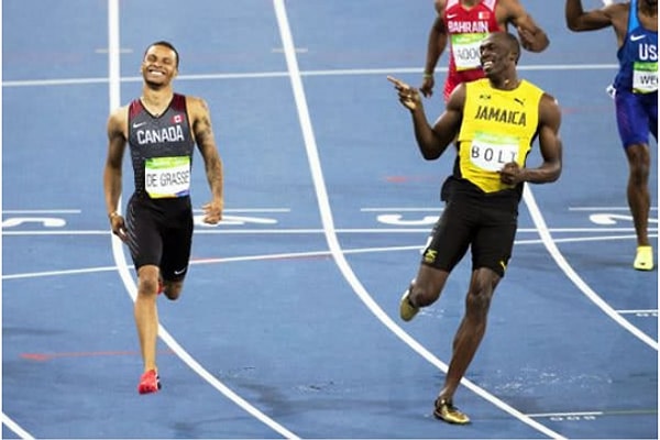 3. Андре де Грассе и Усэйн Болт выглядят так, будто они вышли на утреннюю пробежку, а не пытаются выиграть полуфинал на Олимпийских играх.