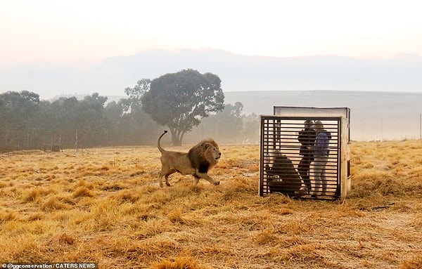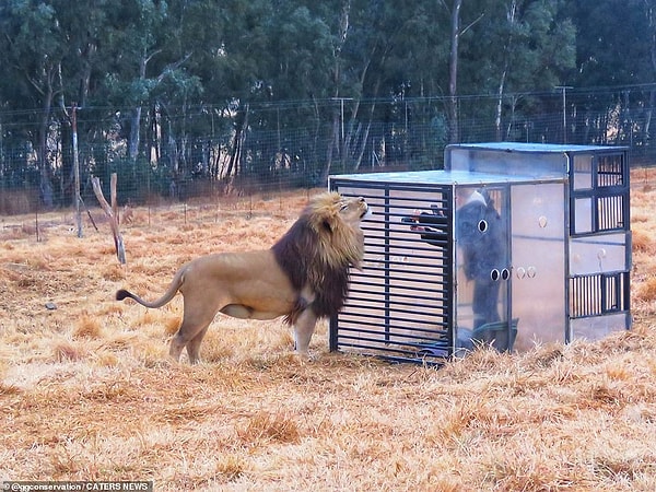 Львиный заповедник GG в Харрисмите, Южная Африка, позволяет посетителям стоять в клетке для фотографов, чтобы безопасным и гуманным способом увидеть потрясающих африканских львов.