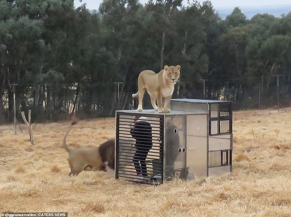 Заповедник для львов придумал способ поближе познакомить посетителей с большими кошками - поместив их в клетку.