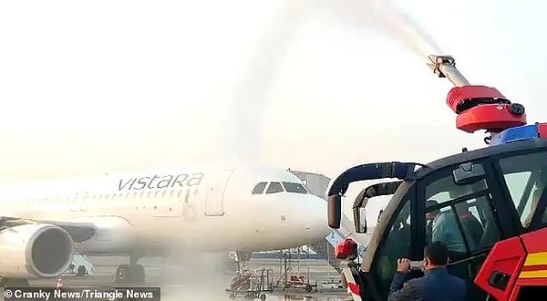 Посадку пришлось отложить, пока к самолету не доставили пожарную машину, что было снято членом экипажа.