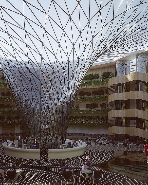 В здании в форме пончика будут использоваться солнечные батареи и ветряные турбины для производства чистой энергии без отходов, а крыша в форме вихря будет собирать дождевую воду для орошения зелени.