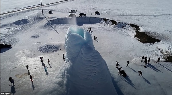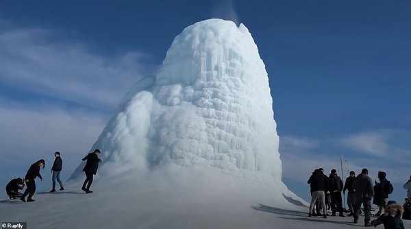 Замерзшая структура высотой 14 метров образовалась над подземным источником, который все еще извергает воду, которая почти мгновенно замерзает и образует конус.