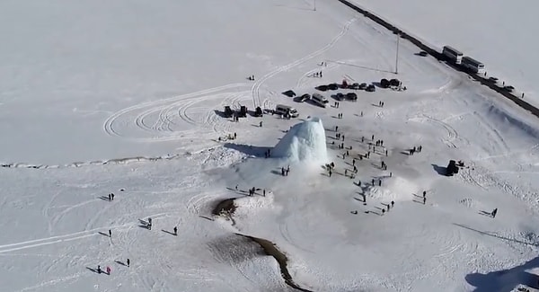 В прошлом году в этом районе образовался ледяной вулкан меньшего размера, но местные жители говорят, что последний из них - первый, который непрерывно распыляет частицы воды из верхнего отверстия, которое выглядит как дым, извергнутый вулканом, заполненным лавой.