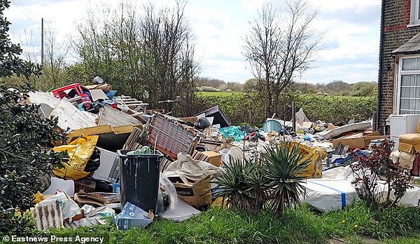 За последние восемь недель в палисаднике дома в Апминстере, графство Эссекс, была свалена огромная 2-метровая куча мусора.
