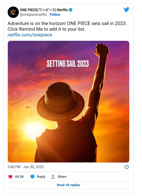 «Приключение не за горами! «Ван Пис» отправится в плавание в 2023 году. Нажмите «Напомнить», чтобы добавить его в свой список.»