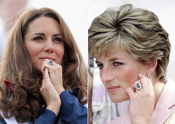 Кейт Миддлтон носит голубой овальный сапфир и бриллиантовую группу из шри-ланкийского камня, которое ранее принадлежало принцессе Диане.