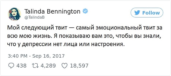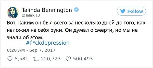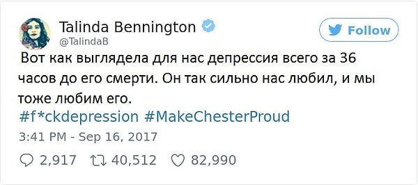 «Мой следующий твит — самый эмоциональный твит за всю мою жизнь. Я показываю вам это, чтобы вы знали, что у депрессии нет лица или настроения», — написала Талинда, прежде чем выложить в Твиттер 40-секундное видео, где Честер смеется и улыбается, пробуя конфеты Jelly Beans со своими детьми.