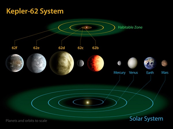 Диаграмма сравнивает планеты Солнечной системы с системой Kepler-62, состоящей из пяти планет с центром в звезде типа К2, видимой в созвездии Лира. Две планеты с потенциальной жизнью находятся слева, наша Земля — вторая справа.