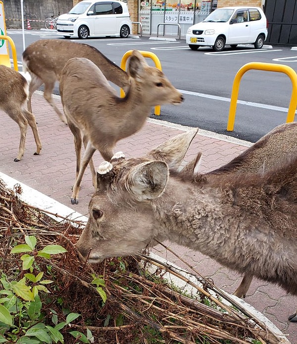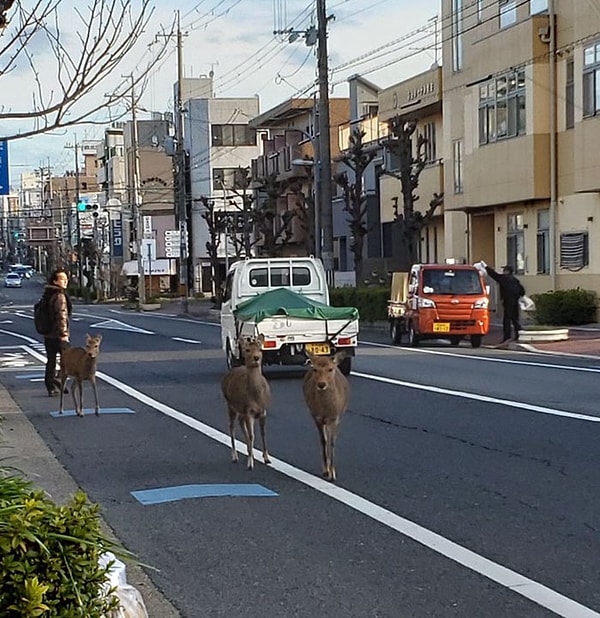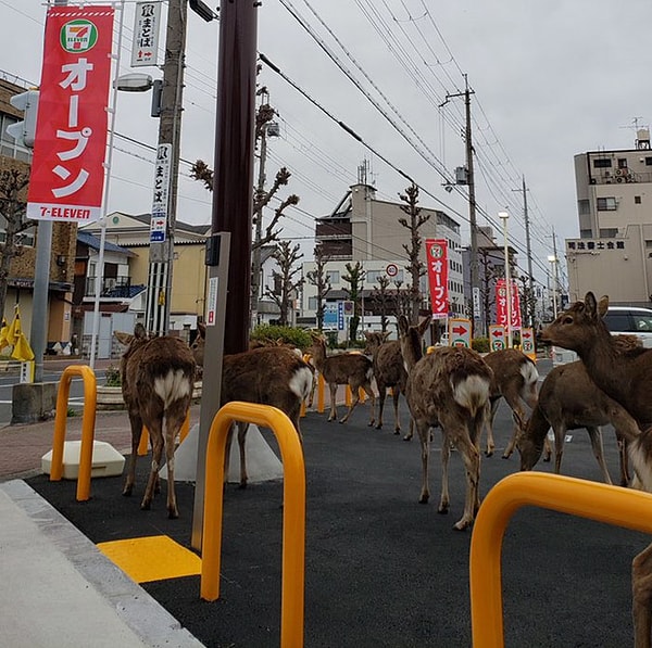 Например, в Японии, где олени, которые являются местными жителями парка Нара, были замечены на улицах города в поисках пищи. Обычно парк кишит туристами, так как живущие там пятнистые олени являются местной достопримечательностью. Туристы кормили животных специальными крекерами, которые предназначены для оленей и продавались в том же парке, однако, поскольку число посетителей резко сократилось в последние недели, у оленей, похоже, не было другого выбора, кроме как покинуть свои территории, чтобы найти что-нибудь пожевать.