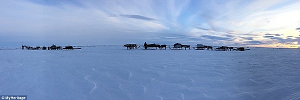 8. Ненецкие семьи следуют за естественными миграциями северных оленей, путешествуя по плоской, мрачной местности и замерзшим водам реки Обь.