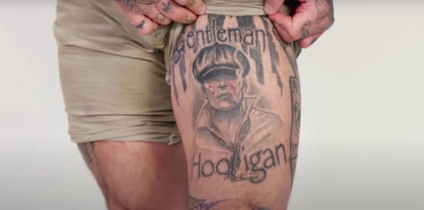 «Я нашёл эту классную фотографию, и это был Киллиан Мёрфи из «Острых козырьков». Я попросил Джона [татуировщика] изменить её, чтобы она не была так похожа на Киллиана. Когда я её получил, я подумал: «Хорошо, это не совсем похоже на то, будто у меня есть татуировка Киллиана Мёрфи на бедре».